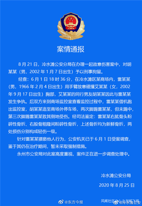 8月25日,@冷水灘公安 發佈案情通報,公開回應此事,@東方今報 記者再次專訪當事男生胡林(化名)父親胡師君。