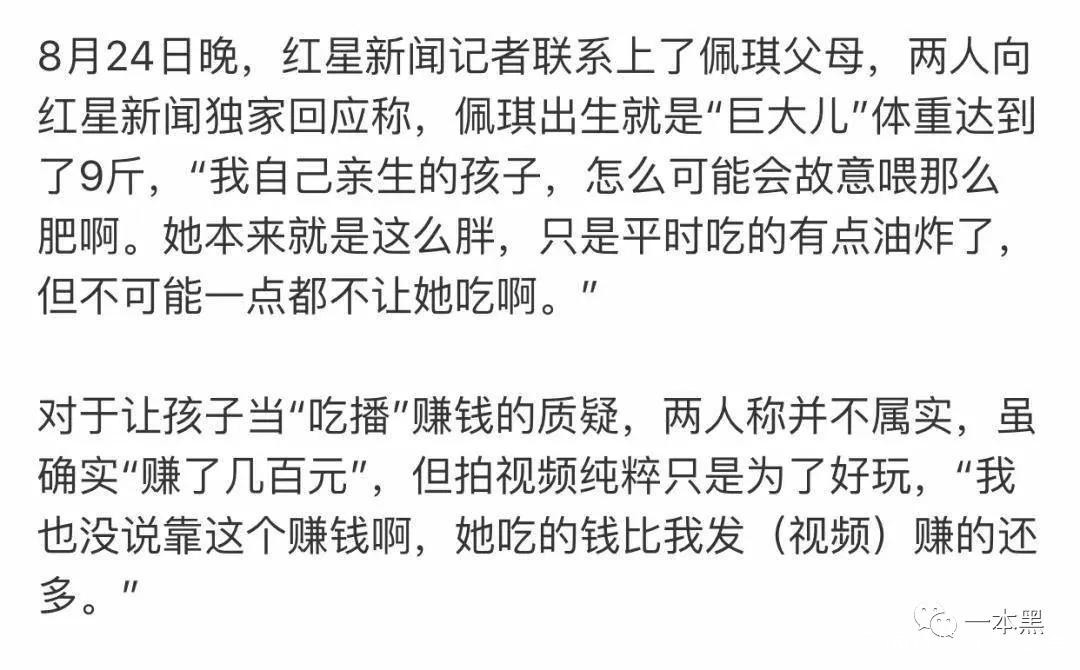 在面對媒體質疑時,小女孩的爸媽回應:“女兒生下就是巨嬰,本來就胖”、“只是吃的有點油炸了,不可能一點都不吃”、“家有3套房、月入過萬”、“做吃播只是為了好玩,不靠這個賺錢”。