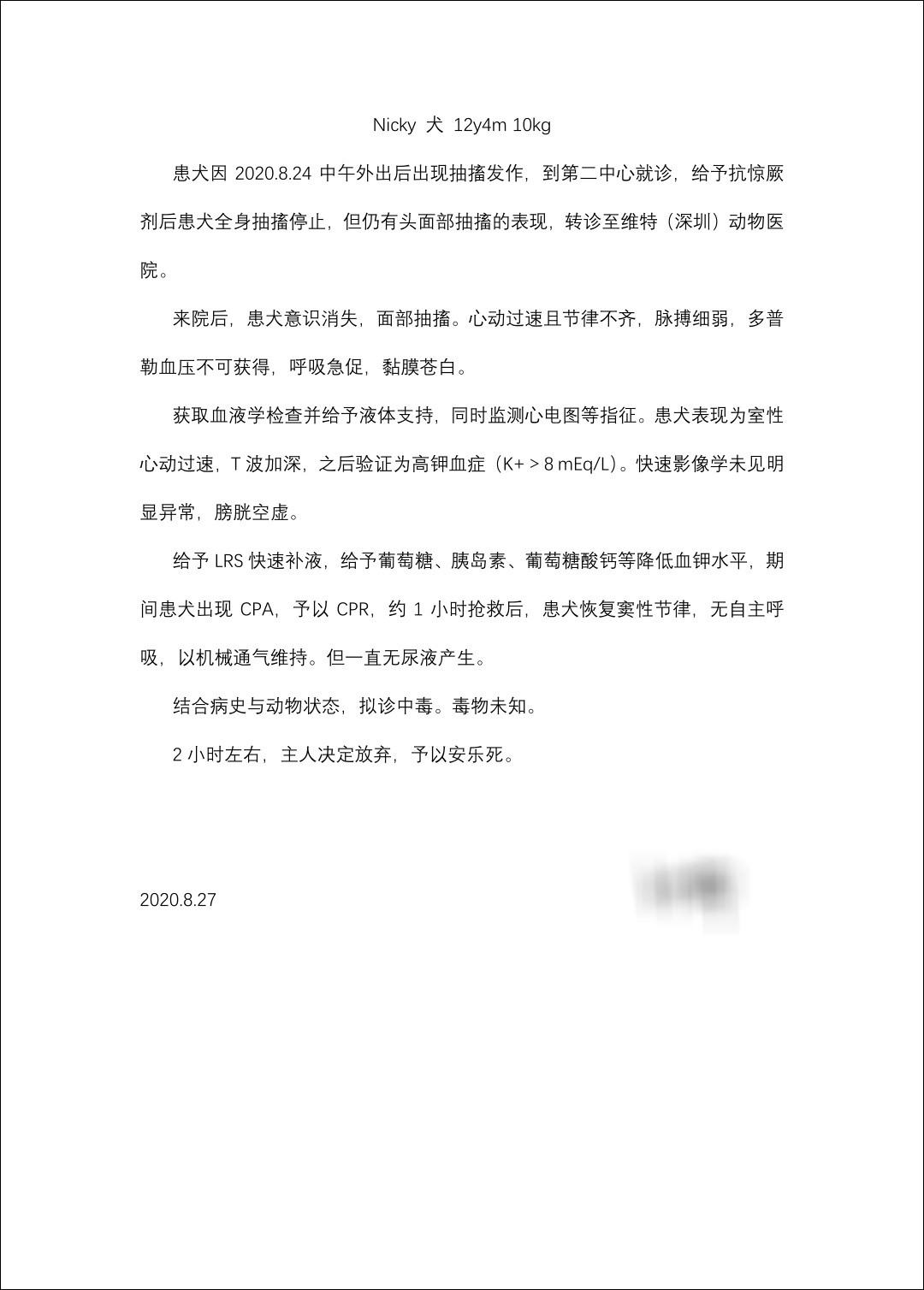 據黃女士介紹,自己養的狗名叫Nicky,是一隻普通的京巴犬,從她八歲起就與之相伴,今年已是第13年。8月24日下午1點,黃女士在小區樓下遛狗,回家後3點半左右,Nicky開始口吐白沫、抽搐,大小便失禁,第一時間送去寵物醫院搶救。搶救持續到晚上九點,Nicky還是不幸去世了。