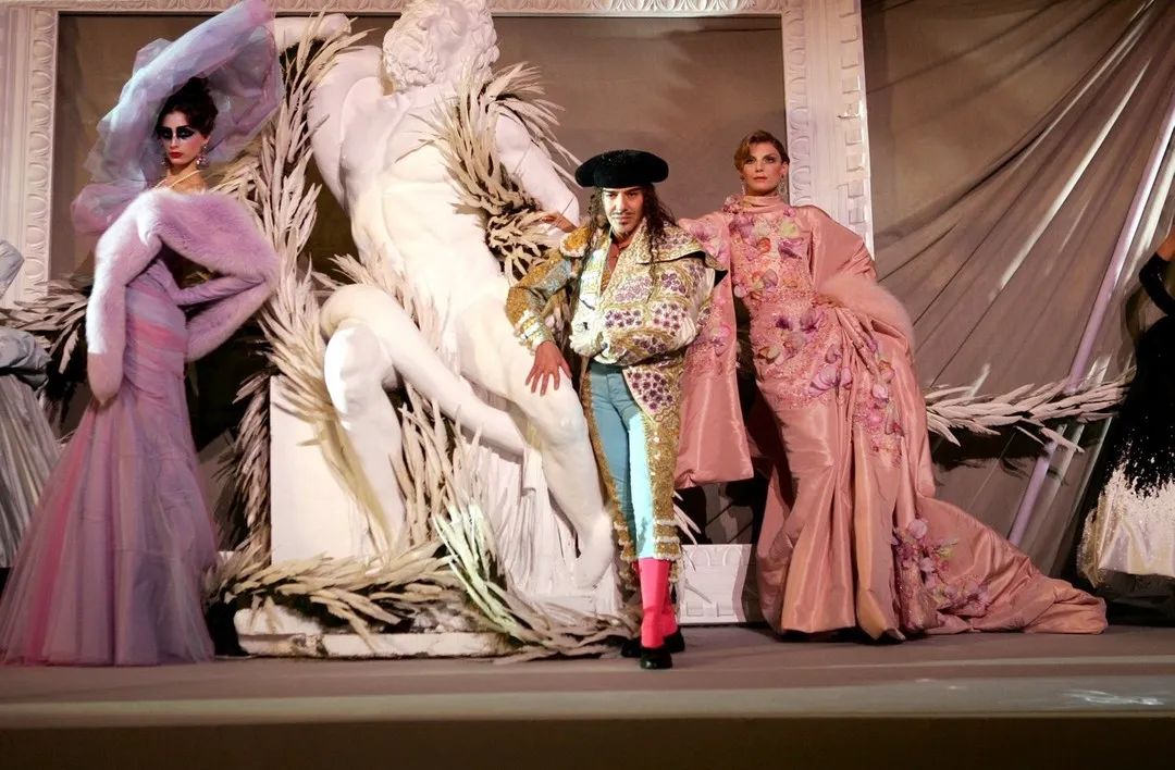 2004年的秋冬高級定製系列中,John Galliano復現輝煌浮華的維多利亞時期,誇張的羊腿袖、宮廷印花、寶石珠寶紛紛登台,模特甚至被加冕帶上女王頭冠,奢華至極。