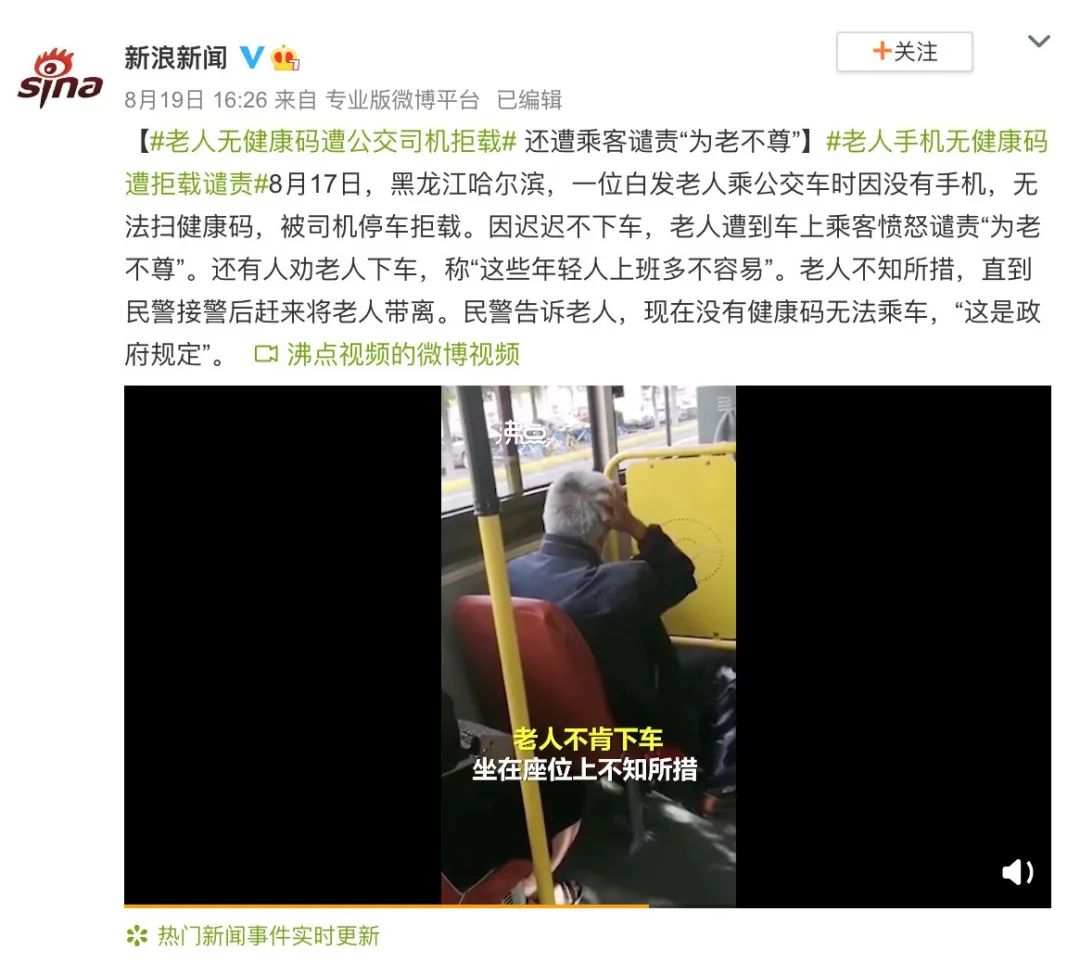 就在上週末,哈爾濱一位老人因沒有健康碼被公交拒載,又因遲遲不肯下車被斥責“為老不尊”。在民警趕來後的詢問過程可以看出,老人對健康碼一無所知,甚至沒有手機。