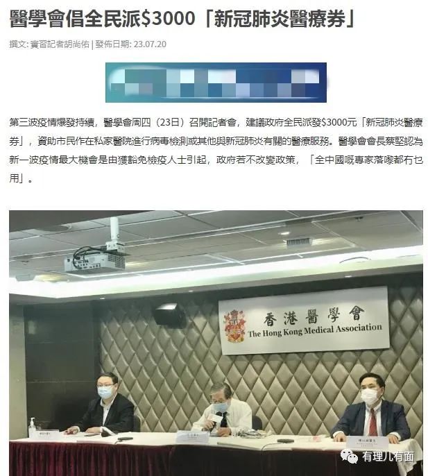 翻看新聞,香港醫學會7月份確實呼籲港府發每人三千元醫療券。在引起網民熱烈討論後,該醫學會又急忙發表聲明澄清,自己從未囤積與新冠病毒相關的檢測試劑。好吧,我相信,協會自己哪會囤,要囤也是具體私營醫院囤啊。