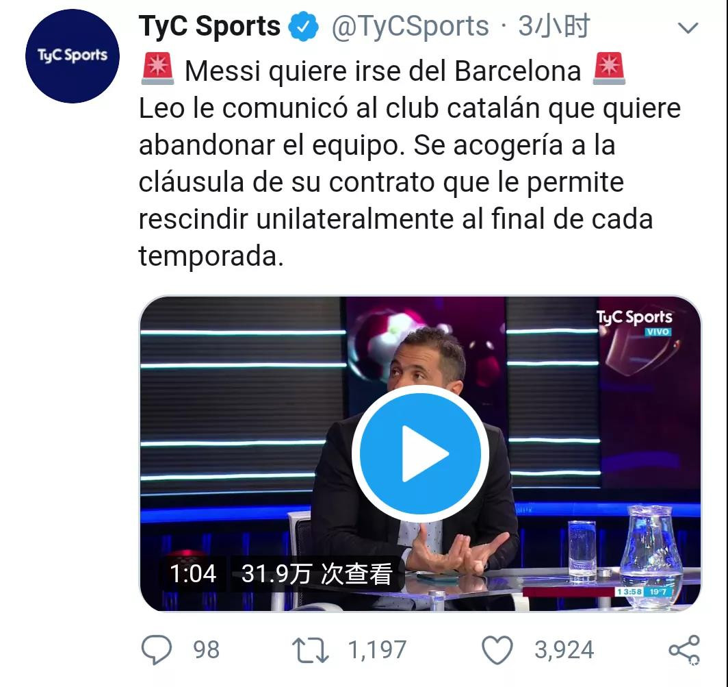 北京時間8月26日凌晨,阿根廷最大的體育電視台TyC報道,梅西方面已經通過傳真,告知巴薩希望離隊,且準備動用合同中的自由離隊條款。