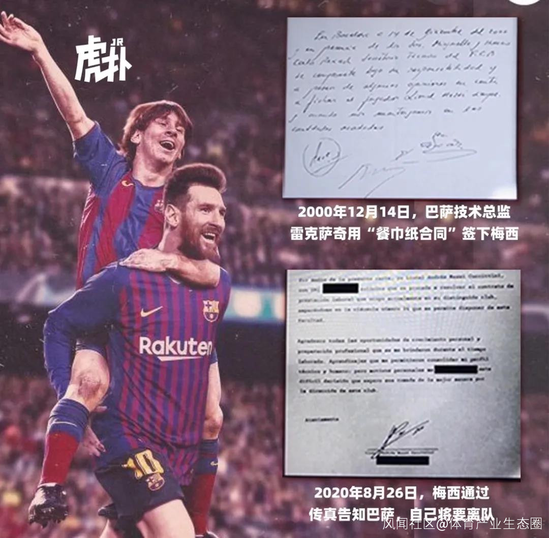 2000年12月14號,巴薩技術總監雷克薩奇用「餐巾紙合同」簽下梅西;2020年8月26日,梅西通過傳真告知巴薩,自己將要離隊。(圖片來自虎撲)