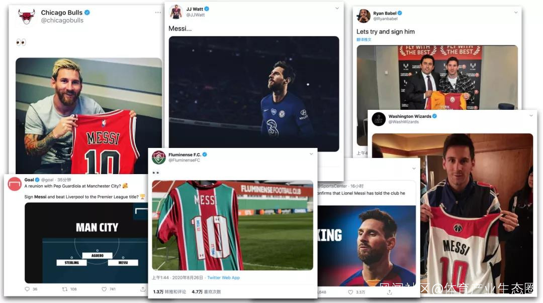 梅西的轉會風波,也在社媒上引發了一波「跨界狂歡」。諸多知名體育俱樂部與明星們,都「蹭」起了球王轉會的熱度。