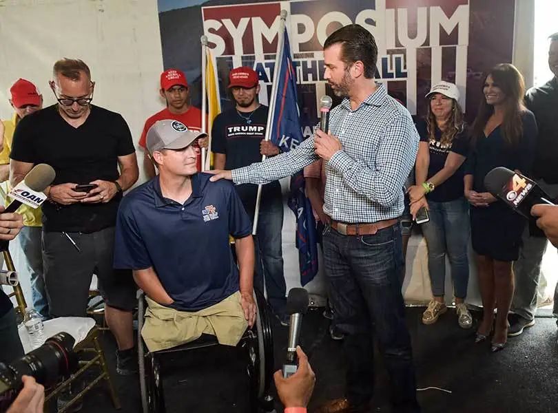 ● Brian Kolfage和Donald Trump Jr.站在第一堵用收到的捐助蓋成的牆前 / WeBuildTheWall官網