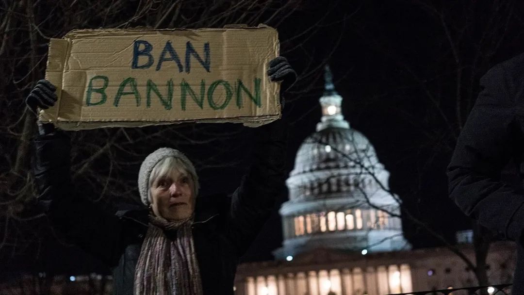 ● 標牌上寫着“禁止班農”。自特朗普政府成立以來,班農的政策和立場一直受到左翼人士的強烈反對 / 網絡