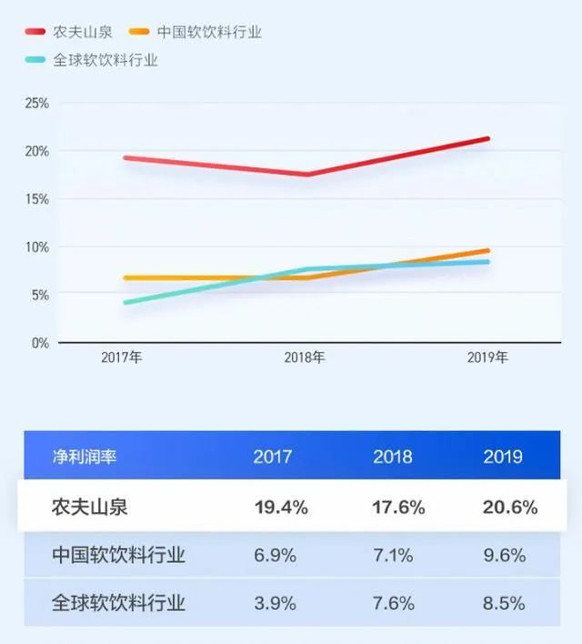 2019年農夫山泉淨利率為20.6%,遠高於國內軟飲行業9.6%的平均淨利率。