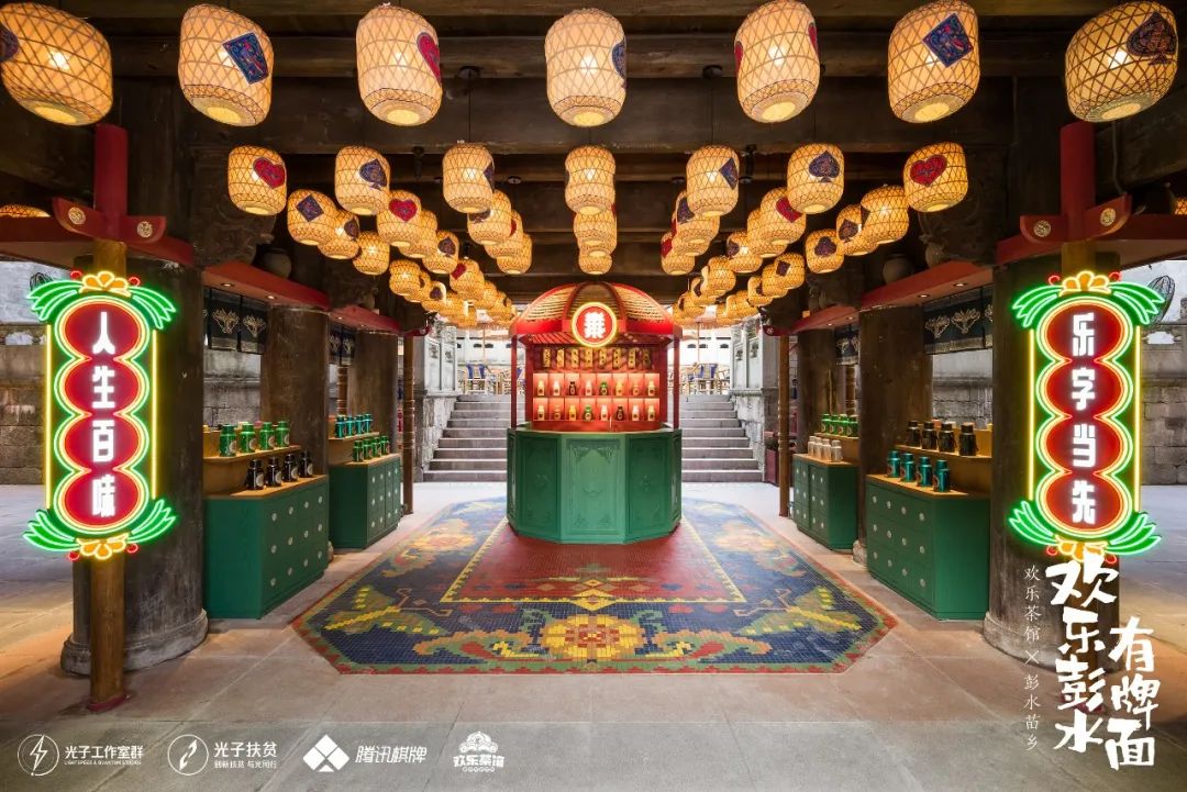 茶館一層是主場地,擺着茶桌,遊客到來時,好客的當地人會泡好茶請客人品嚐。茶桌前是一個大舞台, 彭水本地的“嬌阿依”們會定期在這裏演唱苗族歌曲《嬌阿依》。走上二層,可以看到由騰訊棋牌參與文創包裝設計的彭水特產。除此之外,還能夠進入數字化體驗區,用數字化方式體驗苗族文化。