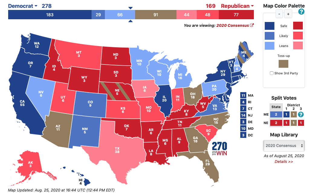 按照www.270towin.com這個網站的分析,截止美國時間8月25號,民主黨深藍183票,淡藍27票,淺藍68票,搖擺91票,淺紅44票,淡紅48票,深紅77票。