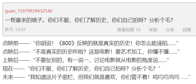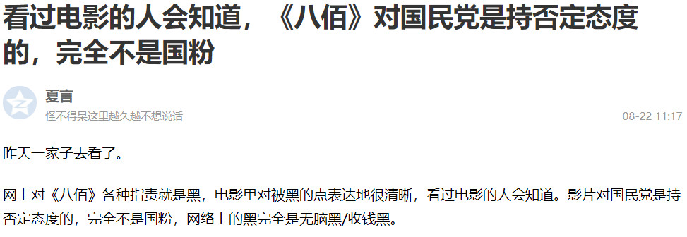 我認為我對《800》主旨的判斷是正確的,因為幾乎所有認可《800》的影評都是這麼説的,而X博上此起彼伏的“蔣公千古”“X國萬歲”更是側面證明了我的判斷。