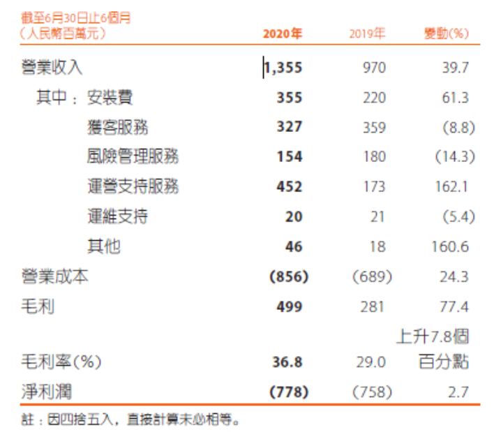 財報顯示,金融壹賬通上半年實現營業收入13.55億元,同比增加39.7%;錄得淨虧損7.78億元,虧損同比擴大2.7%;實現毛利4.99億元,同比增加77.4%;公司毛利率為36.8%,較去年同期的29%增加7.8個百分點。