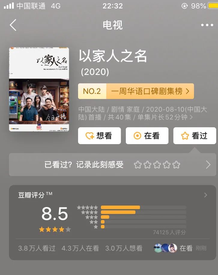 像我最近看的《以家人之名》,前面還在好好講温馨的家庭故事,開局大捷,豆瓣評分一度在8.5以上。