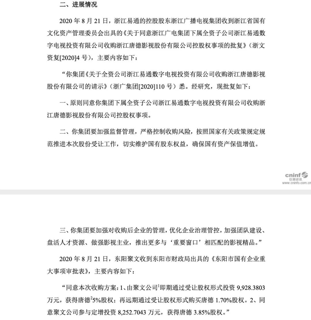 由於國資主管部門審批流程耗時較長,直到8月21日浙江易通與東陽聚文收到同意收購批覆,此次變更才得以繼續向下推進,距離收購成為定局仍有一段距離。