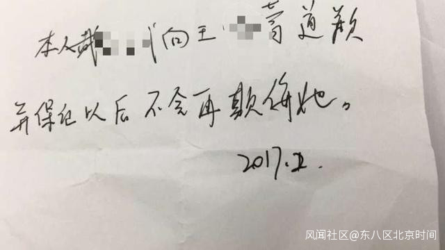 毛女士稱,這份道歉保證條是戴某所寫,女兒要求戴某要文字保證此後這類騷擾行為不再發生,“戴某隨手寫了道歉保證信,手機拍照後發給我女兒”。