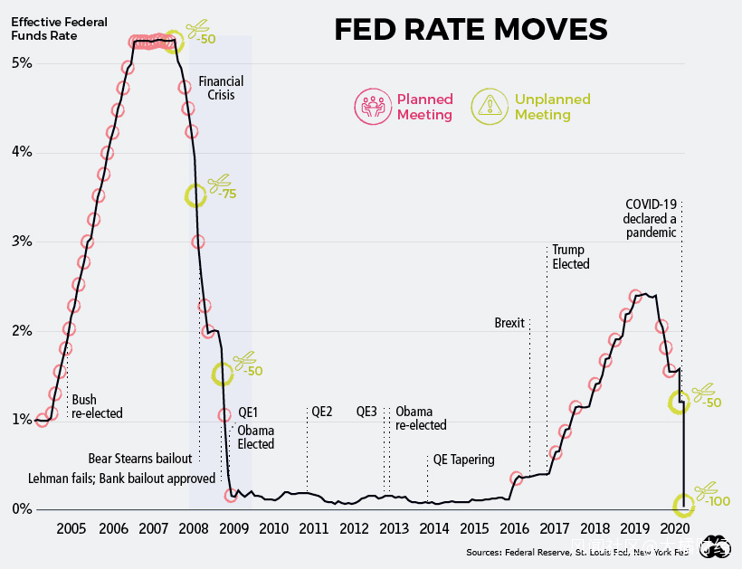 這是2005年到現在的美聯儲利率走勢圖。大家注意2009年到2016年最貼近底下的這一段,這是金融危機後,全球大放水的時刻。