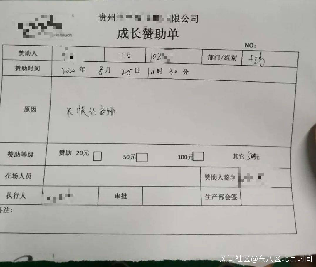 於是,小傅沒有按照該生產線經理所安排的去做,隨即,經理開了一張成長贊助單給他,小傅介紹,贊助單的言外之意就是“罰款單”,罰款金額為500元,罰款原因:“不服從安排。”