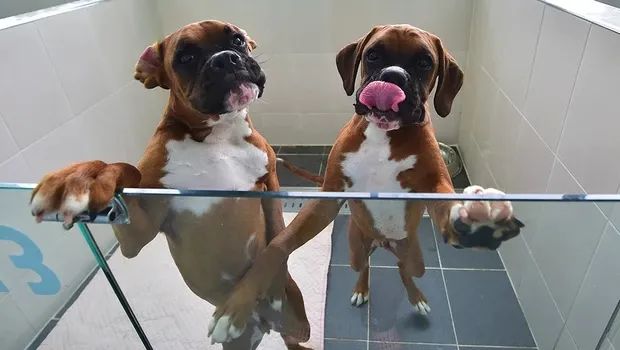 韓國秀巖生實驗室設施內,克隆拳師犬相互擁擠爭奪人的注意力