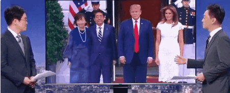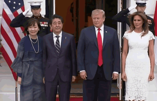 2019年4月,安倍偕夫人出訪美國。白宮前的合影,梅拉尼婭與特朗普合佔大半紅毯,安倍身為客人,卻站在紅毯外。