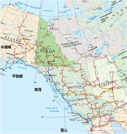 北美洲西部,《坤輿萬國全圖》與今日地理比較 (緯度,刮號內為歐洲人首次發現日期)水潮峯 - Anchorage,Mt.Denali,Turnagain Arms 61°(1778)平地坡 - Kenai Fjords National Park 60° (1791)美灣 - Ketchikan Fjords 55° (1880)雪山 - MountRainier 47°(1792)