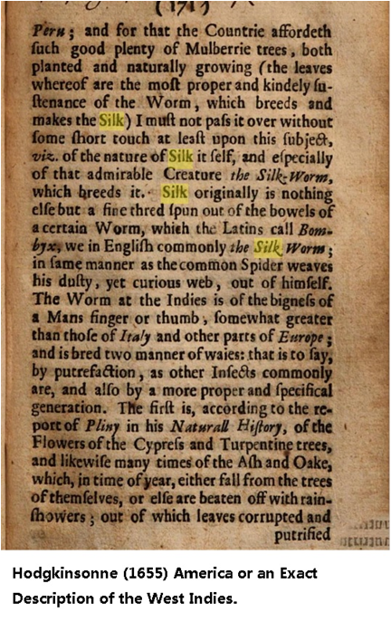 1583年,最早到美洲的英國人哈里奧特(Thomas Hariot)敍述在弗吉尼亞看到的原住民農莊:“好幾次看到蠶繭,像胡桃那麼大。如果我們種植桑樹,找有經驗的人去小心料理,一定會帶來巨大利潤”[12]。 美洲沒有原生白桑樹,只有不能養蠶的紅桑。白桑原產中國,美洲的白桑只能是中國人帶來。馬可孛羅,哥倫布要來中國就是要做絲和瓷器的買賣,根據歐洲的記錄,哥倫布是第一個在美洲看到桑樹的。還有多種西方文獻記載美洲有蠶桑的歷史。西班牙人曾經想在中美洲種桑養蠶,結果無法養活,一怒之下,把桑樹全砍掉。種桑養蠶需要長時期耐心的科學觀察,中國8000年的經驗不是輕易學到的。這些文獻都藏在西方古籍圖書館,互聯網時代被搜出來。美國至今不產蠶絲。