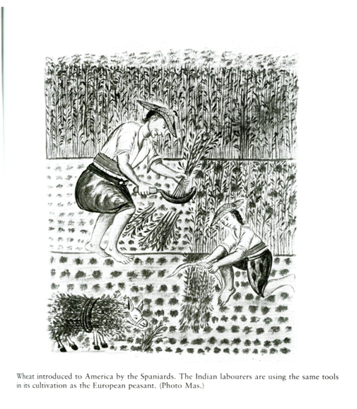 最早期美洲原住民耕作圖,解説中的“印第安人”實際是華人。歐洲人的鐮刀是長柄的,農田沒有行列。