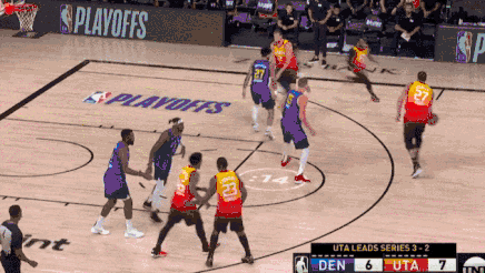 爵士開局第一攻先打了個牛角,然後球被轉移到從底角移動到弧頂的英格爾斯手裏,他和戈貝爾順勢打了一個擋拆,這時約老師站在了罰球線附近的位置。