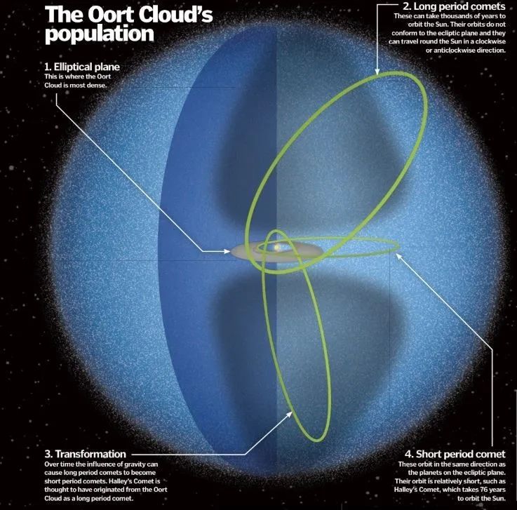 奧爾特雲裏沒有像八大行星一樣巨大的天體,如果宇宙飛船從中飛過很可能什麼都看不到。即便如此,它還是包含了超出我們預料更多的天體,勒布説。雲中大約藏匿有一千億個小天體,絕大部分都是岩石和冰塊。但實際上,由於距離和大小原因,我們還從未直接觀測到過奧爾特雲,但是我們已經有了挺充足的證據:彗星不就是從奧爾特雲不小心飛進內太陽系的嘛。