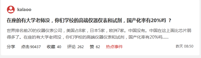 傳送門: 在座的有大學老師沒,你們學校的高端儀器儀表和試劑,國產化率有20%嗎 ? 評論 272 熱點事件
