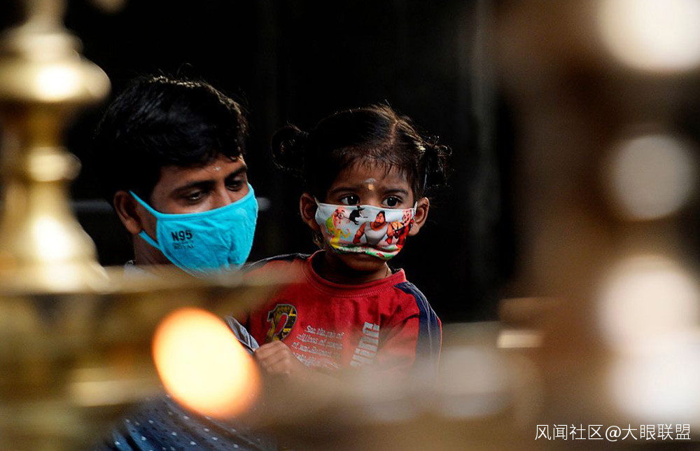 2020年9月1日,隨着印度政府放寬抗疫封國措施,一名男子和他的女兒到訪金奈重新開放的一間寺廟。世界上最嚴格的封國措施並沒有阻止新冠疫情在印度的蔓延。圖片來源:ARUN SANKAR/AFP via Getty Images