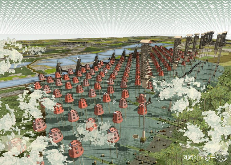 在講話語權之前,先給大家看幾張圖,其實和範文南的插畫描述差不多,但這是一個倫敦大學巴特萊特建築學院的一個學生畢業作品。用插畫的方式表述一個零碳排放的城市,在這樣的建築下人們是如何生活的。當然我們有很多實用主義的人,覺得這個太過藝術不切實際,的確,但這也是目前建築的發展天花板了,全世界的建築設計師在研究後發現,現有材料能夠設計的方案几乎都有了,只有通過不切實際的概念設計才能設計出心中理想的建築了。