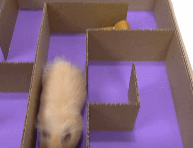 把將倉鼠放進一個紙盒子做成的封閉迷宮裏,在其中設置種種障礙,觀賞它在迷宮裏暈頭轉向地四處碰壁,最終突破重重阻礙走到出口獲得寶藏。簡單來説,倉鼠走迷宮就是這麼回事,大部分情況下,其實迷宮本身也遠遠稱不上有難度。