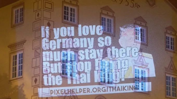 嚴謹的德國人用投影儀對着酒店播放PPT,內容大致是:“如果你熱愛德國,並堅持留在這裏,請停止成為泰國的國王!”