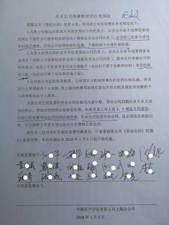 我在2018年1月被中聯資產評估有限公司上海分公司要求籤了個《補充規定》,其第2條規定:“凡有主動提出辭職或不再續簽勞動合同的員工,以及公司在不違背國家法規情況下按照公司規章制度辭退或不再續簽勞動合同的員工,除非公司單獨認可的特殊情況,該員工不再享受未完成全部程序(包括但不限於收款和歸檔)項目的報酬分配(包括但不限於業務和市場方面)”,最後又説:“目前公司已經簽署的勞動合同實質均為壹年期,勞動合同到期後雙方未主動提出終止,勞動合同按照自動續簽處理。如果有員工對上述1、2規定不同意的,目前已經簽署勞動合同到期後就結束,不再自動續簽勞動合同。且必須現在就提出來,可以按照公司原有規定結合行業慣例合情處理”。當時沒有和員工協商,所有員工都簽字了。