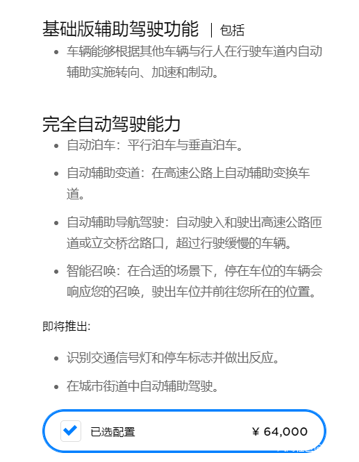 並且,特斯拉最近還推出了“完全自動駕駛”升級套件,在海外版本中,這個套件的售價為8000美元(約合人民幣5.6萬元),不過在我們國內其售價為6.4萬元左右。
