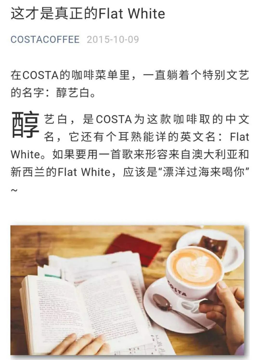 不久後,Costa也推出了相同的單品,還在自己的微信公共帳號上,以一篇名為《這才是真正的Flat White》的文章,隔空喊話星巴克。