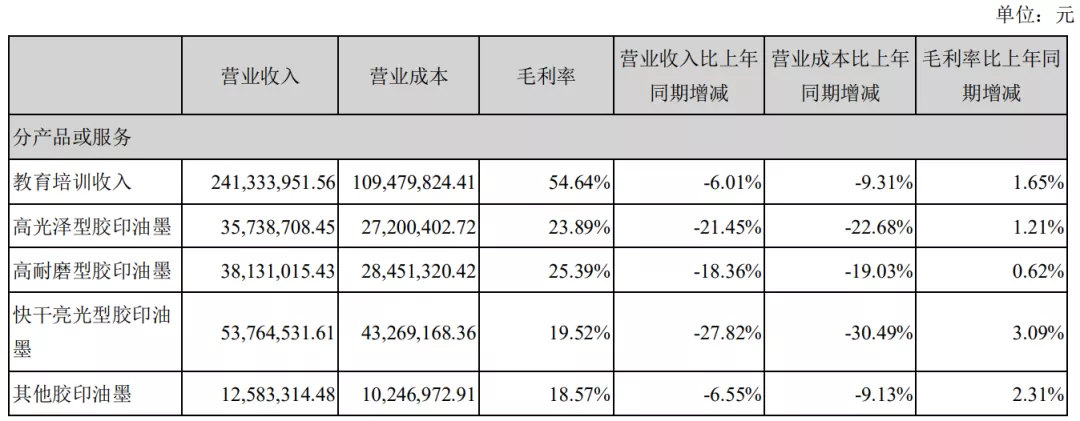 這也影響了相關業務的毛利率。2018年精細化工品業務毛利率為21.21%,教育業務毛利率在46.26%;2019年精細化工品業務毛利率為22.33%,教育業務毛利率在52.29%;2020年上半年,教育培訓業務毛利率更是達到54.64%,而各類油墨產品毛利率均處於20%左右。