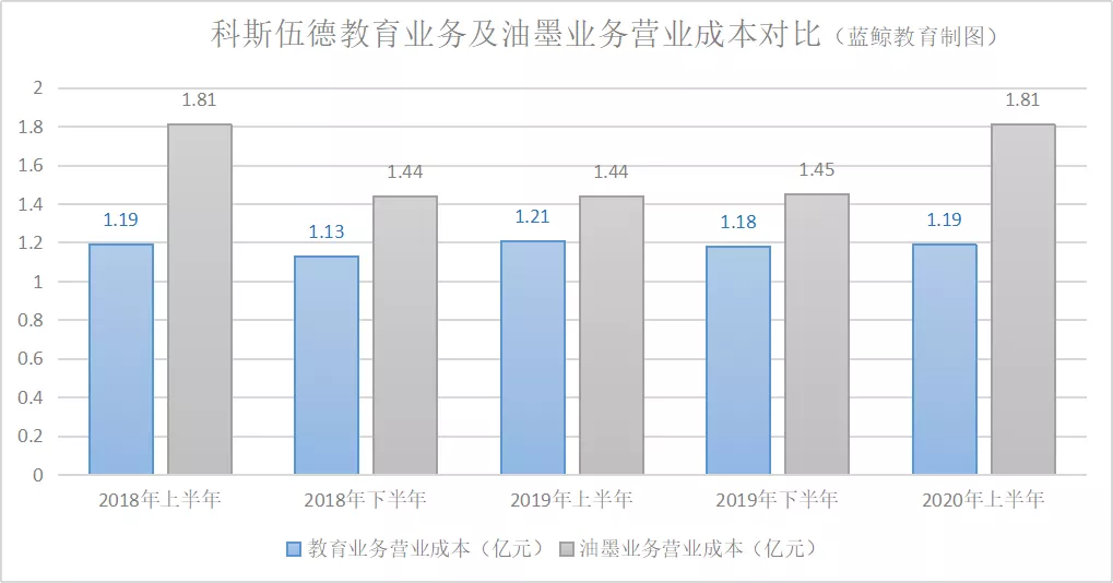 從營業成本上看,因上游化學原材料漲價迅猛,致使從業企業成本高企,科斯伍德油墨產品營業成本始終居高不下。自2018年上半年至2020年上半年,油墨產品為代表的精細化工品業務的營業成本,始終高於教育業務的營業成本。但教育業務的營收,大多要高於同期的精細化工品業務。