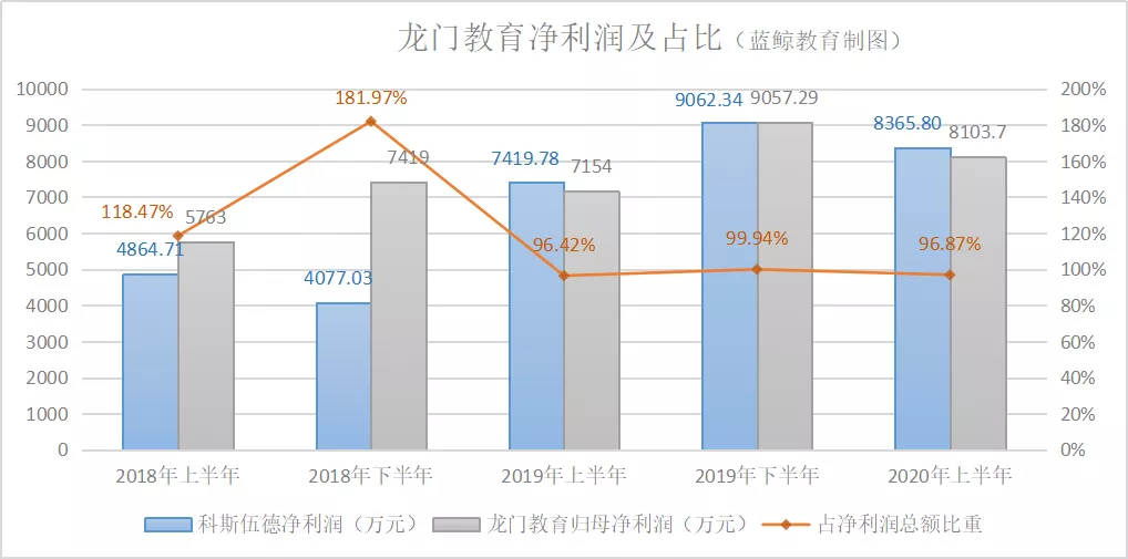 在受疫情期間線下教培停課影響較大的今年上半年,龍門教育依舊強勢實現淨利潤8103.7萬元,同比增長13.28%、環比下降10.53%;淨利潤額佔科斯伍德淨利潤高達96.87%。