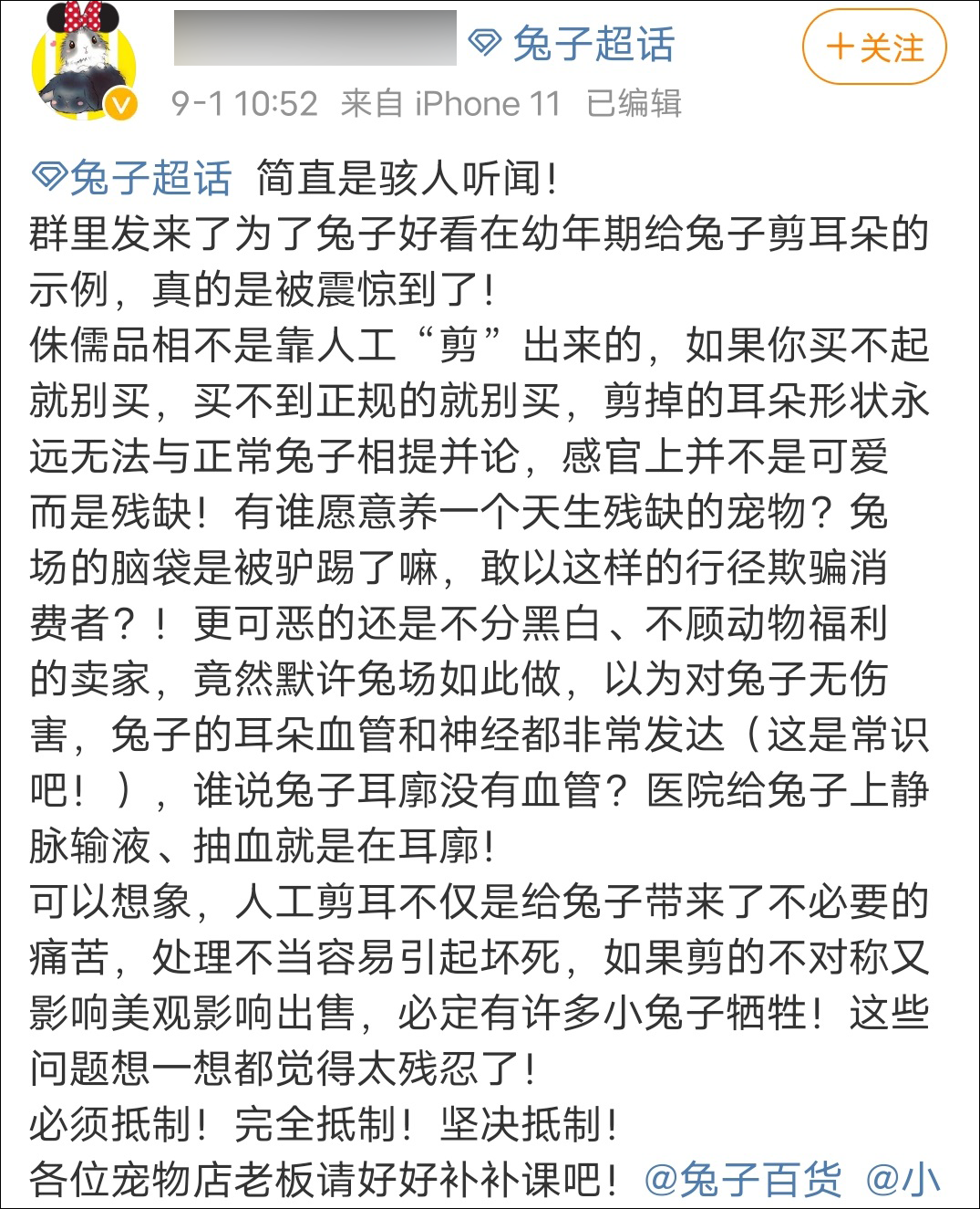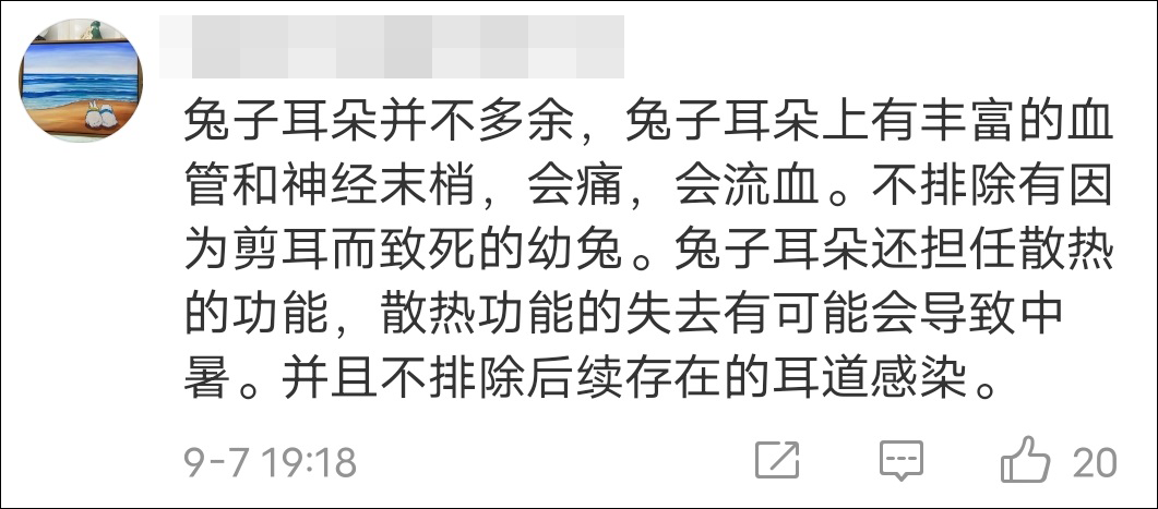 有網友指出,剪耳朵就是殘忍。在價格欺詐的需求之上,對兔子的耳朵“一刀剪”。