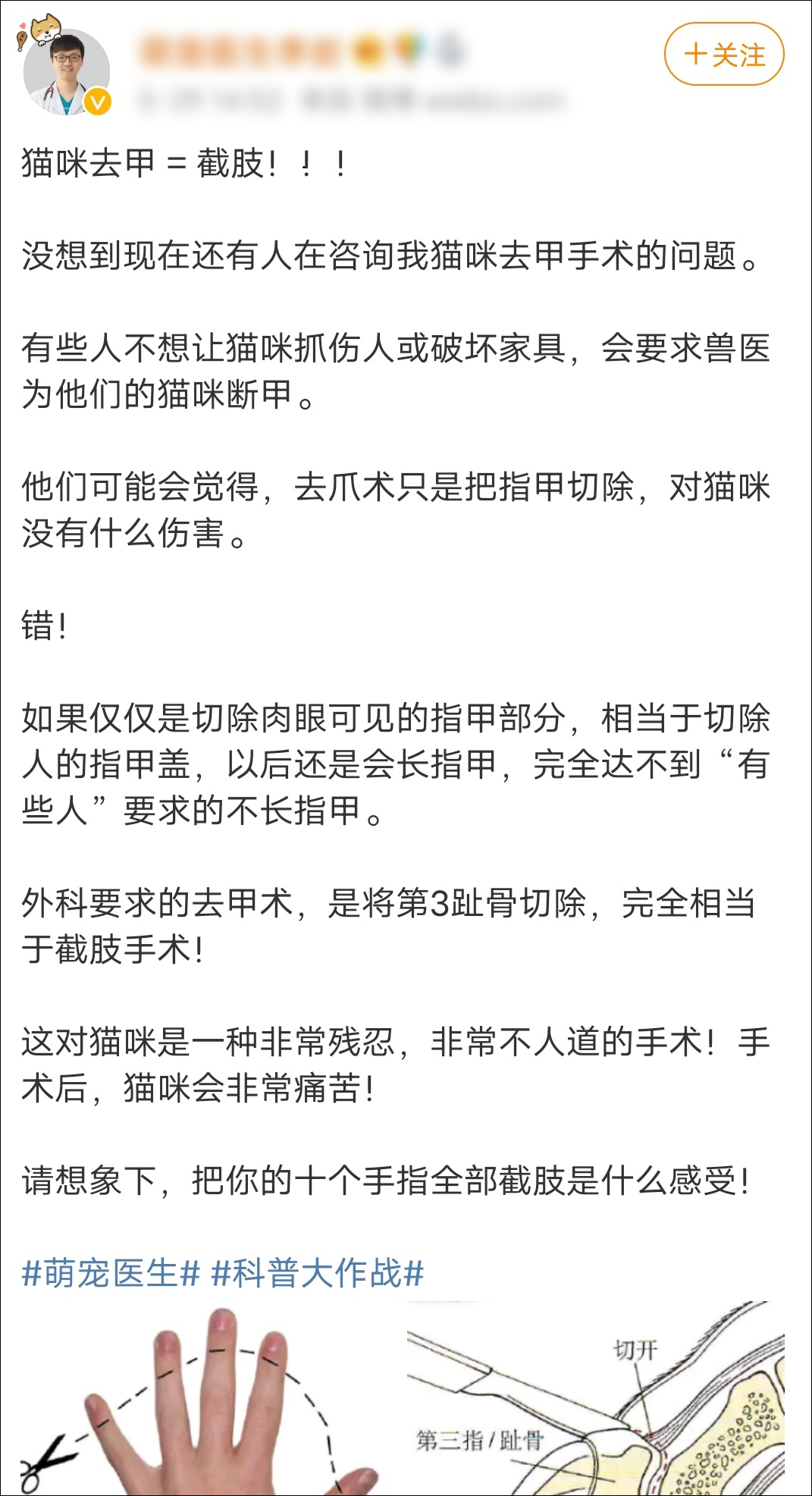 有寵物領域從業者則指出,所謂的“去爪”,其實就是截肢,貓咪會非常痛苦: