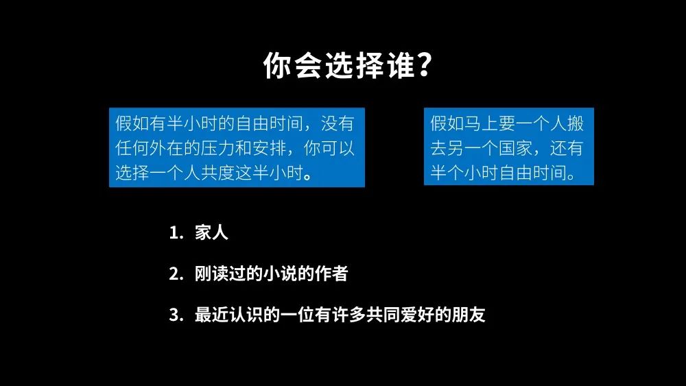 第一,假如有半小時的自由時間,沒有任何外在的壓力和安排,你可以選擇一個人共度這半個小時, **你會選擇和誰在一起?**家人、剛讀過的小説的作者、還是最近認識的一位有許多共同愛好的朋友?