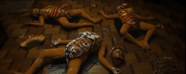 因為蟑螂有分食同伴屍體的習性,蟑螂老哥的兒子和妻子在悲痛中吃了他的屍體,這悲情的一幕讓女主都不忍直視。