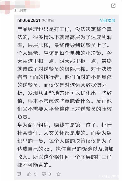 然後,企業各級高管為了達成利潤率,層層壓榨,最後傳導到外賣員身上了。