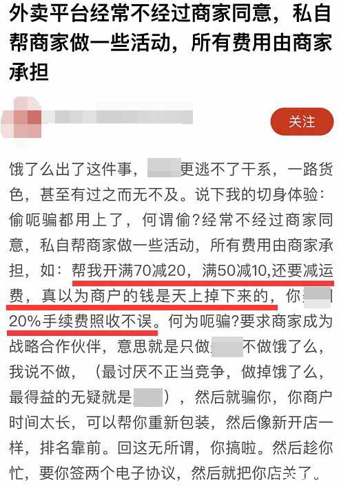 比如,有網友提到,有外賣公司會不經過商家同意,私自幫商家做活動,所有費用還要由商家承擔,自己的手續費卻照收不誤。