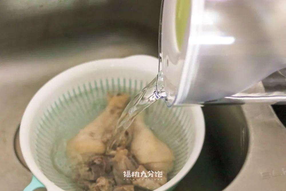 就把雞腿和豬骨都撈出來,用涼水沖洗乾淨。
