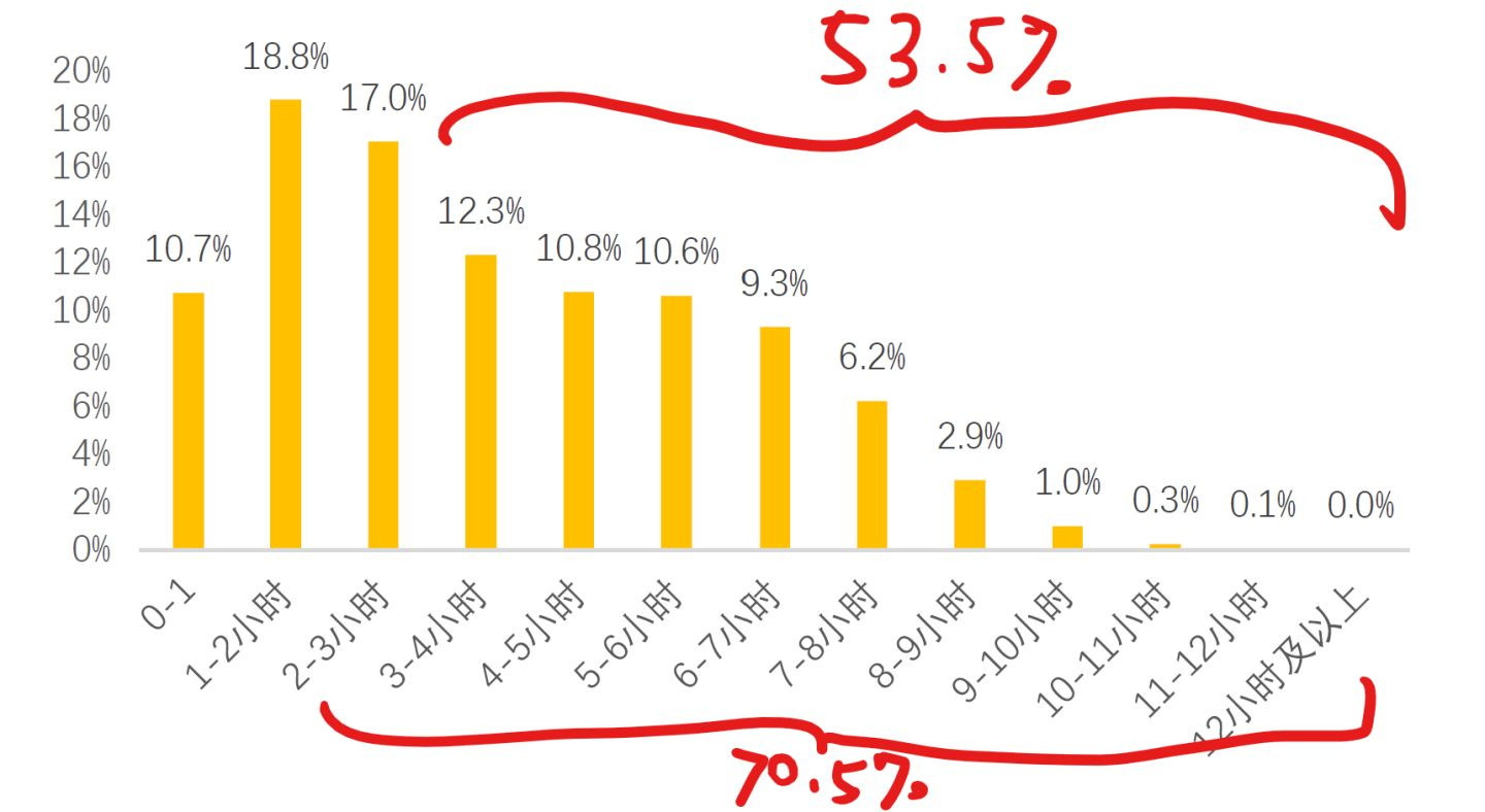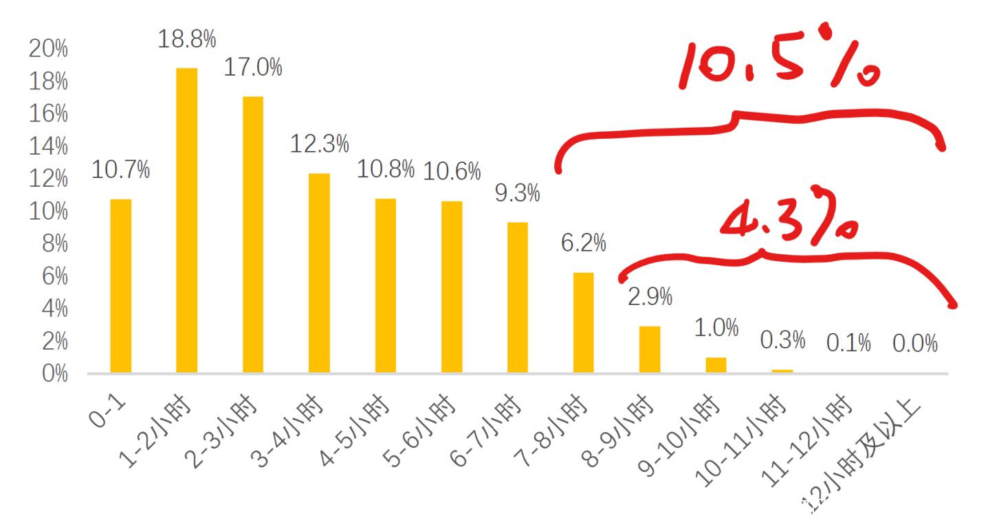 根據收入分佈,收入在4000-8000與10000元以上的騎手有53.4%,加上收入在8000-10000之間的,至少有60-65%的騎手的收入在4000元以上。那麼,在60-65%百分位的4000元收入騎手,對應的工作時長是多少呢?