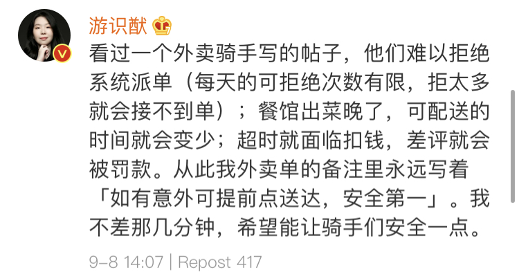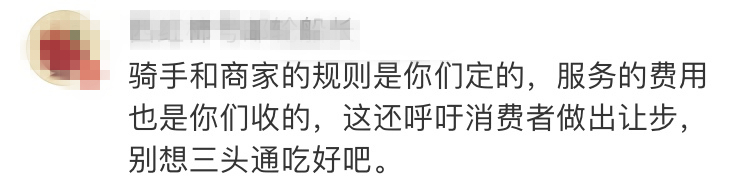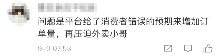 但更多的網友卻指出,平台閉口不提派單系統給騎手帶來的壓力,卻將責任轉移給消費者,是在“道德綁架”用户。