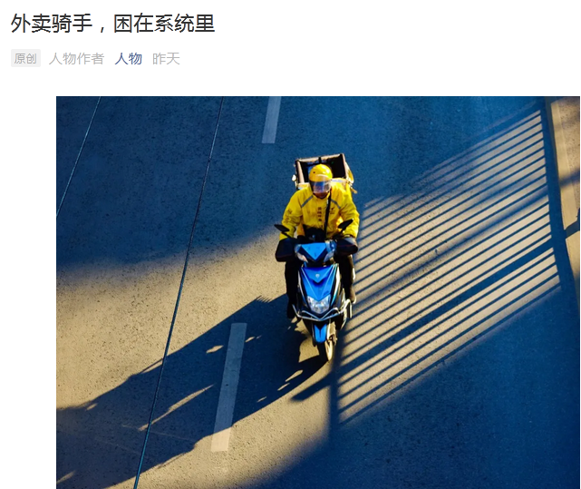 在網絡熱傳的《人物》雜誌文章《外賣騎手,困在系統裏 》裏,外賣騎手是被平台系統算法與數據支配的“工具人”,根本沒有選擇的餘地。