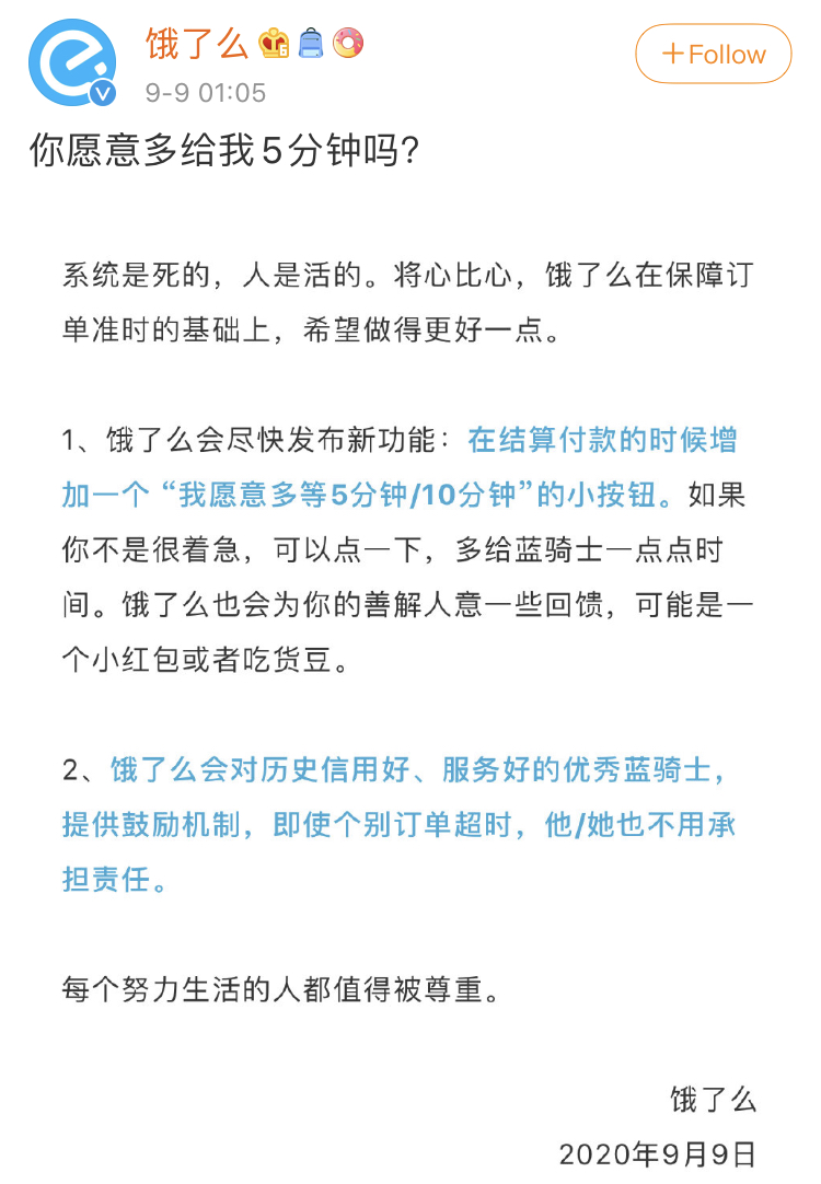 為了回應網友的質疑,9日凌晨,餓了麼在微博和微信兩段同時發佈聲明《你願意多給我5分鐘嗎?》。